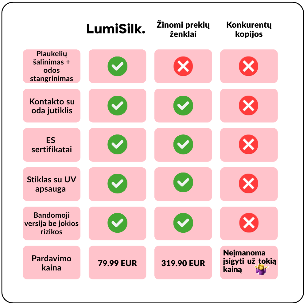 Štai „LUMINA“ – sprendimas Nr. 1 plaukelių šalinimui namuose, kuris visam laikui sustabdys plaukelių augimą ten, kur jų nenorite: pažastyse, ant kojų, ant veido... Ir taip – net bikinio srityje! Rezultatus pamatysite vos per 3 savaites, o galutinį rezultatą pasieksite per 6–12 savaičių.